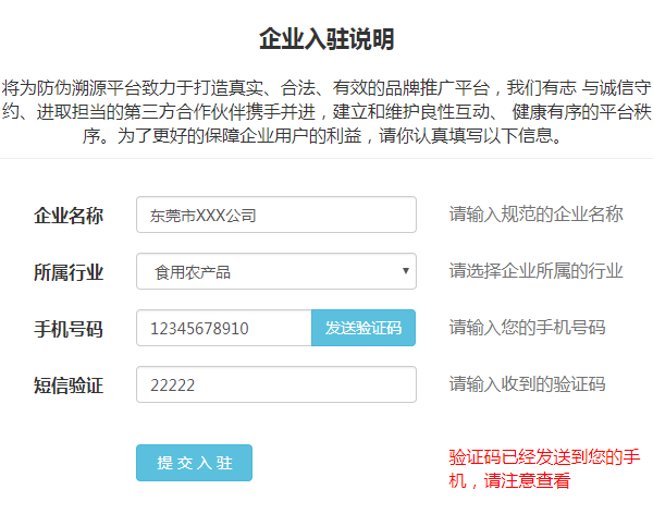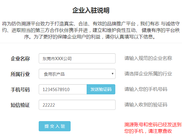,如果提示“溯源賬號和密碼已經發(fā)送到您的手機,請注意查收”